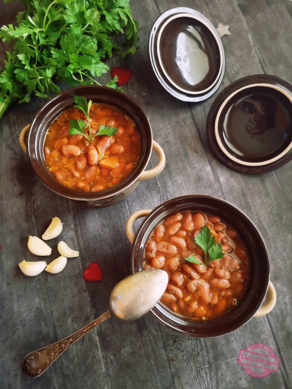 Оставете боба на котлона да кипне отново и го махнете. Сложете в него пресованите скилидки чесън, овкусете с джоджен и поднесете топъл, топъл.