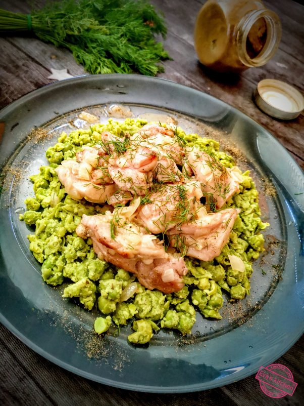 Грахът бланширайте във вряща вода докато хубаво омекне. Отцедете го и го сложете в купа. Намачкайте го докато е горещ, овкусете с майораната, оцета, сол и черен пипер на вкус, добавете 1 с.л масло и разбъркайте.