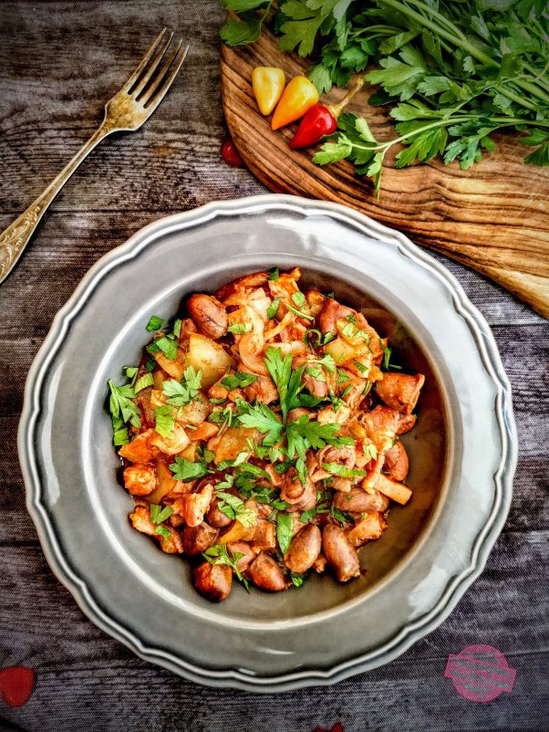 Махнете ястието от котлона, добавете в него маслините и нарязания на дребно магданоз, разбъркайте, ако трябва доовкусете на сол и пипер.