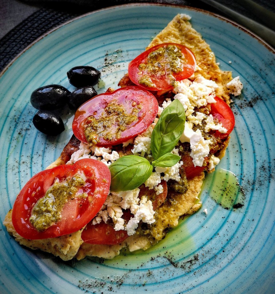 Подредете още няколко кръгчета домати върху омлета, поръсете с песто и полейте с малко зехтин цялата композиция.