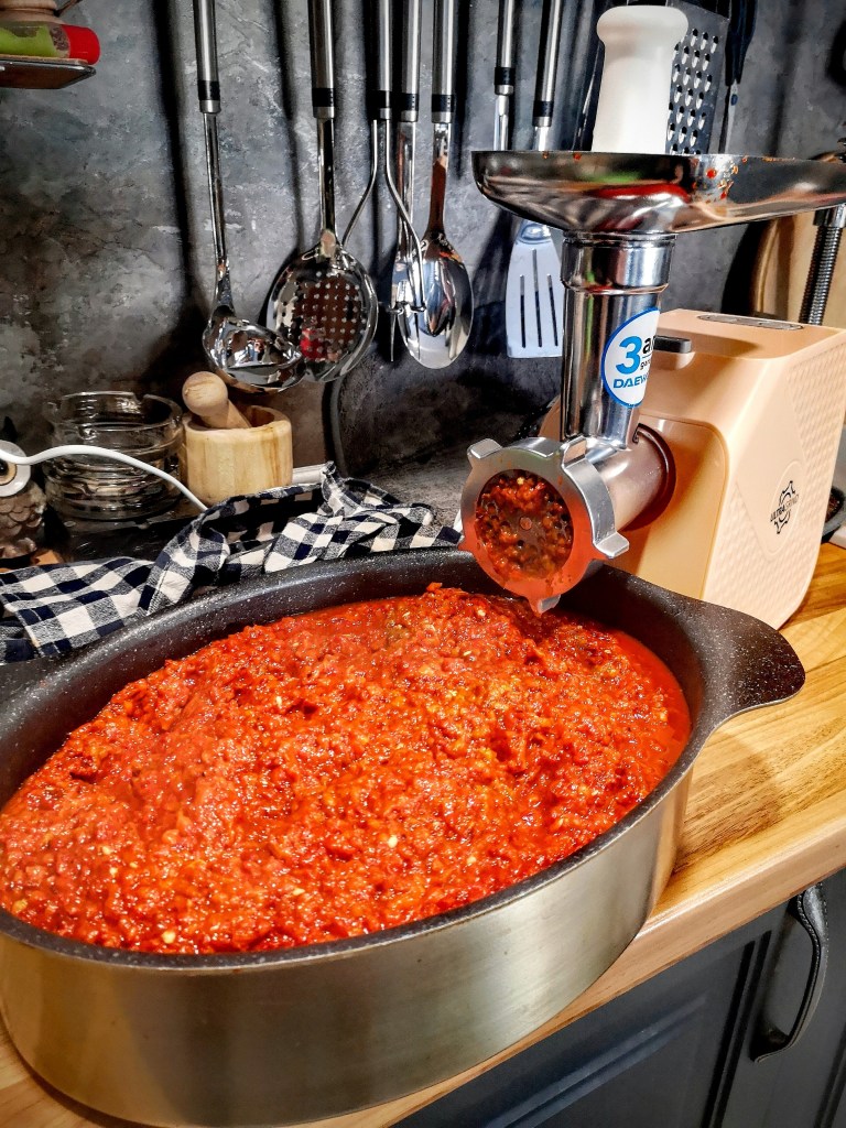 След като чушките ви са готови -изпечени, почистени от семки и обелени, преминете към тяхното смилане. Използвайте машинка за месо.