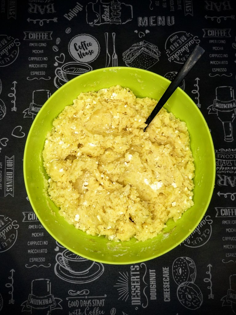 Към нарязаните на дребно патладжани добавете пресованите скилидки чесън, зехтина, сусамовия тахан, сока от лимона, кимиона, киселото мляко и овкусете със сол и черен пипер. Разбъркайте хубаво и ако предпочитате по-гладка консистенция- намачкайте сместа с преса.