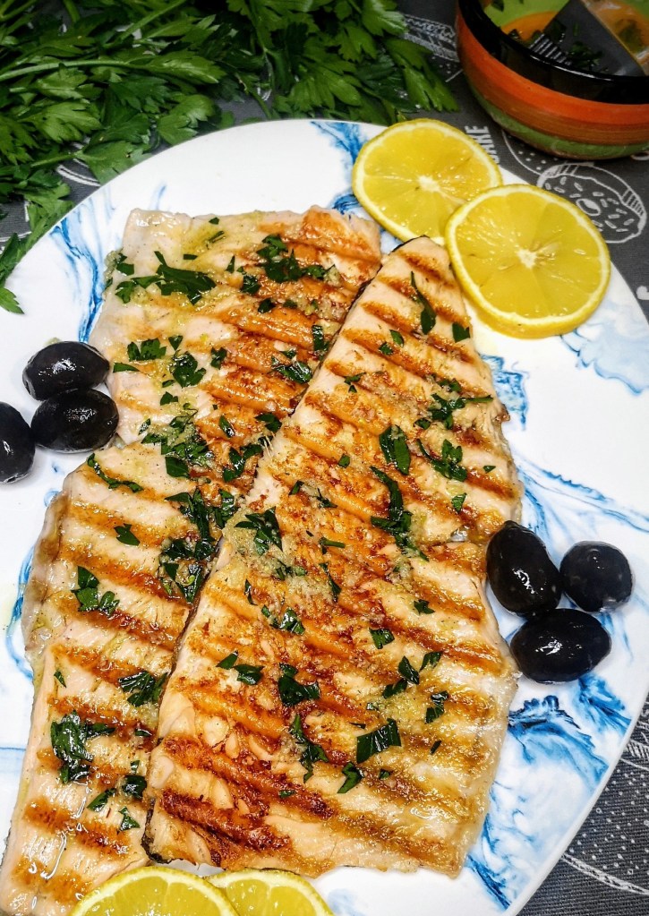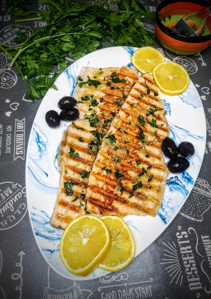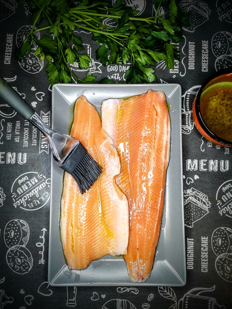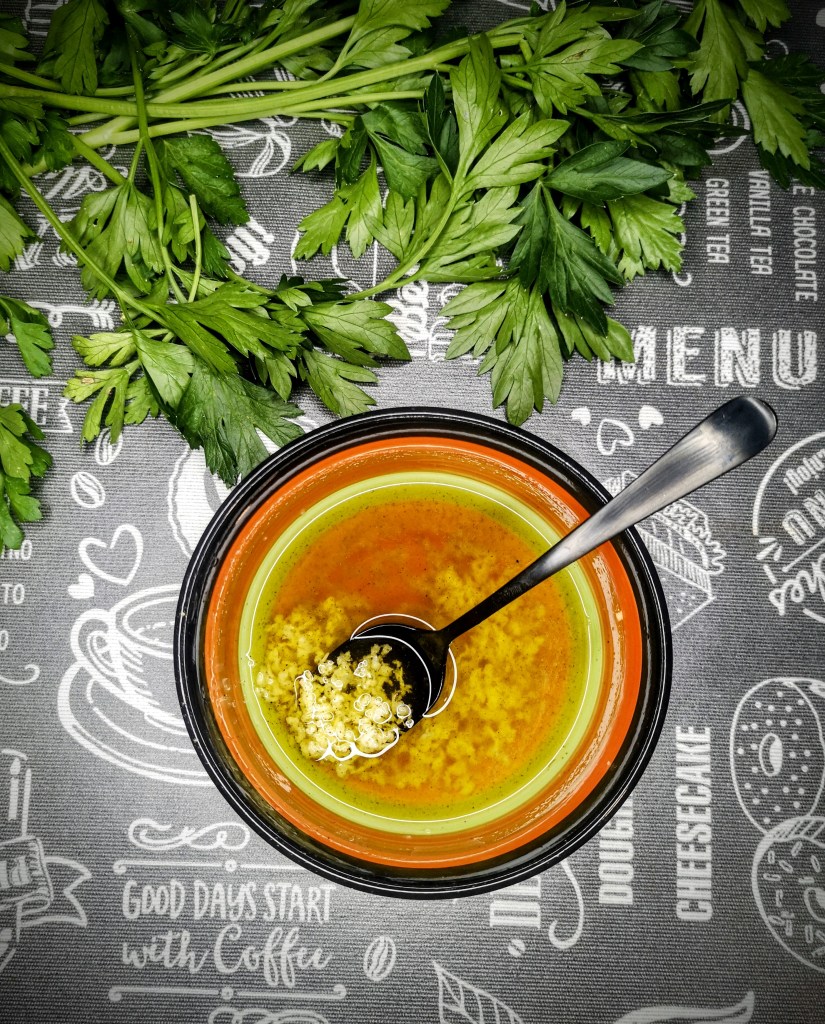 В друга купа смесете пресованите скилидки чесън, соевия сос, зехтина и нарязания на дребно магданоз. Разбъркайте хубаво.