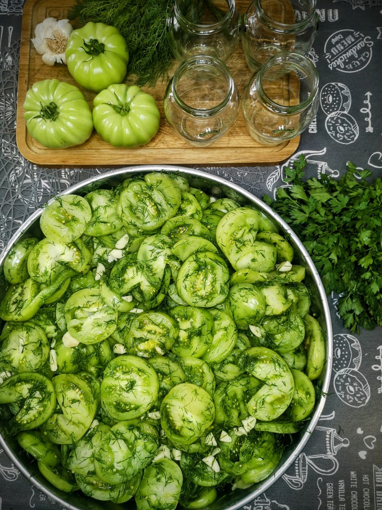 Напълнете в бурканчета и стерилизирайте за 10 минути от завиране на водата.